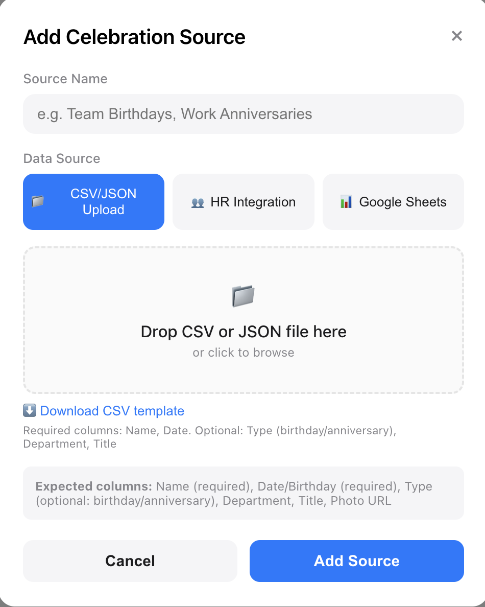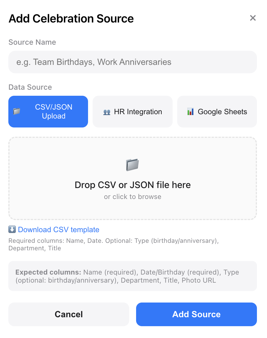 - Enter a Source Name (e.g., “Workday Birthdays & Anniversaries”)
